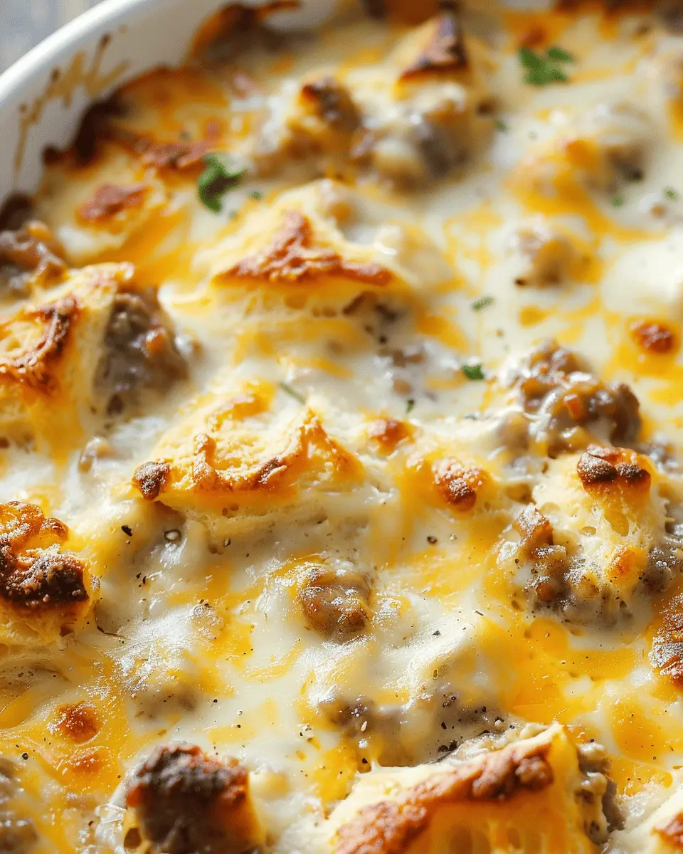 In a saucepan, prepare the gravy by cooking flour and butter together until bubbly, then slowly whisk in your milk until it thickens. Season with salt and pepper. This homemade gravy is the heart of any biscuits and gravy casserole, transforming the dish into a comforting classic. Pour the gravy generously over your layered ingredients, ensuring everything is nice and covered.