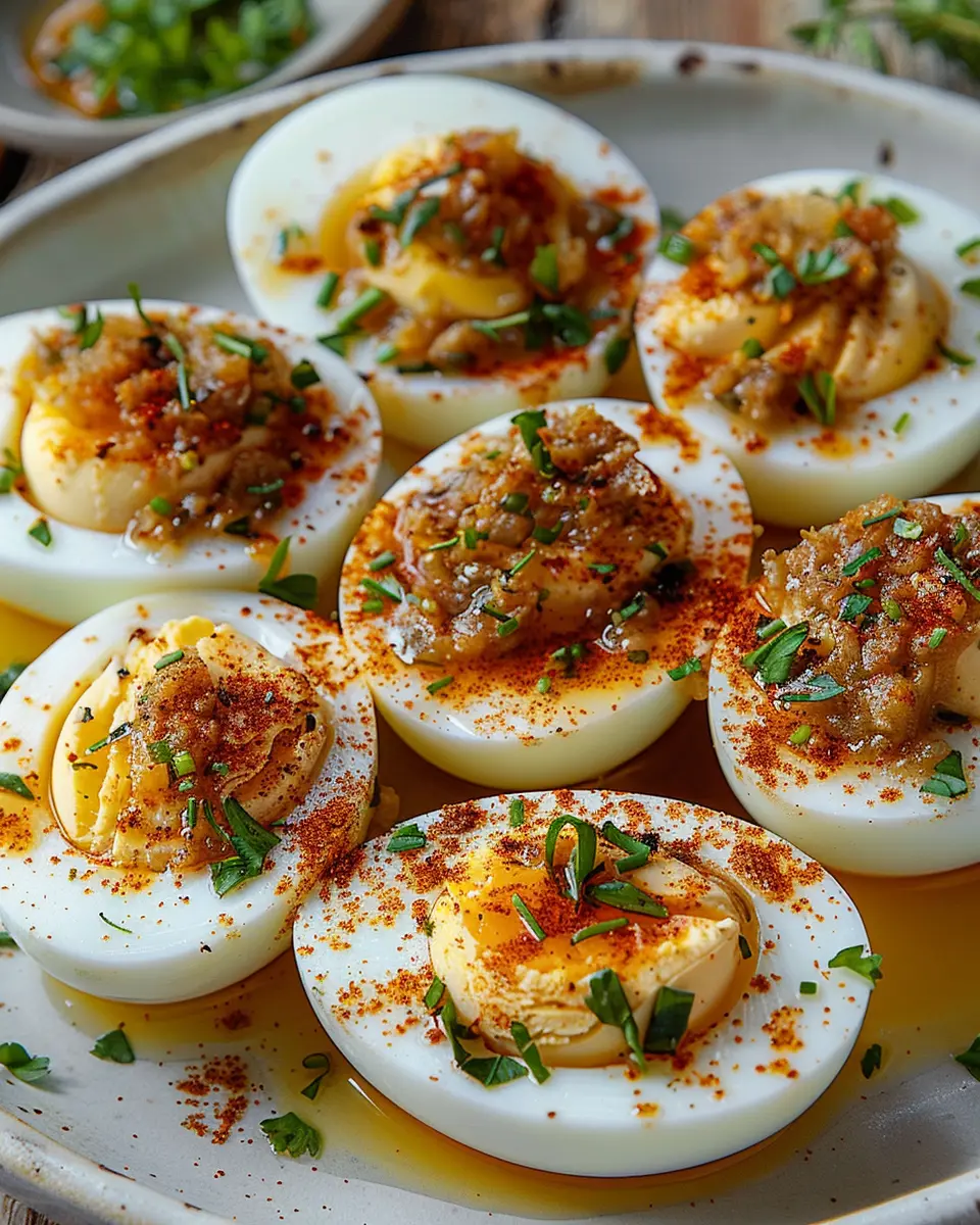 The final touch for your Cajun boiled eggs is the garnish. A sprinkle of parsley can add a fresh color pop against the rich sauce.