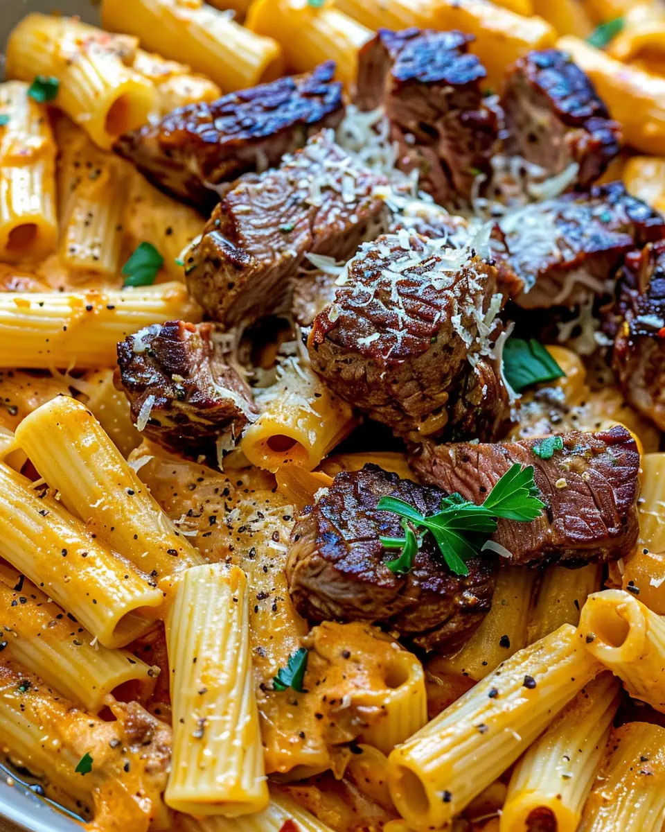 - Plate it Up: Spoon the creamy rigatoni and steak tips into bowls, making sure to get a good mix on each plate.