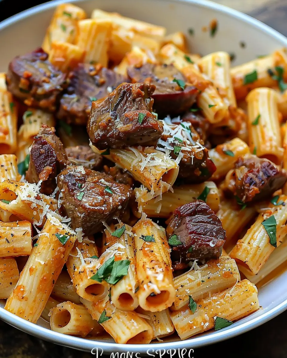 And there you have it! A mouthwatering plate of Cajun steak tips in cheesy rigatoni Parmesan sauce, ready to enjoy. Your kitchen might just become a favorite hangout spot, and your friends will definitely ask for seconds!