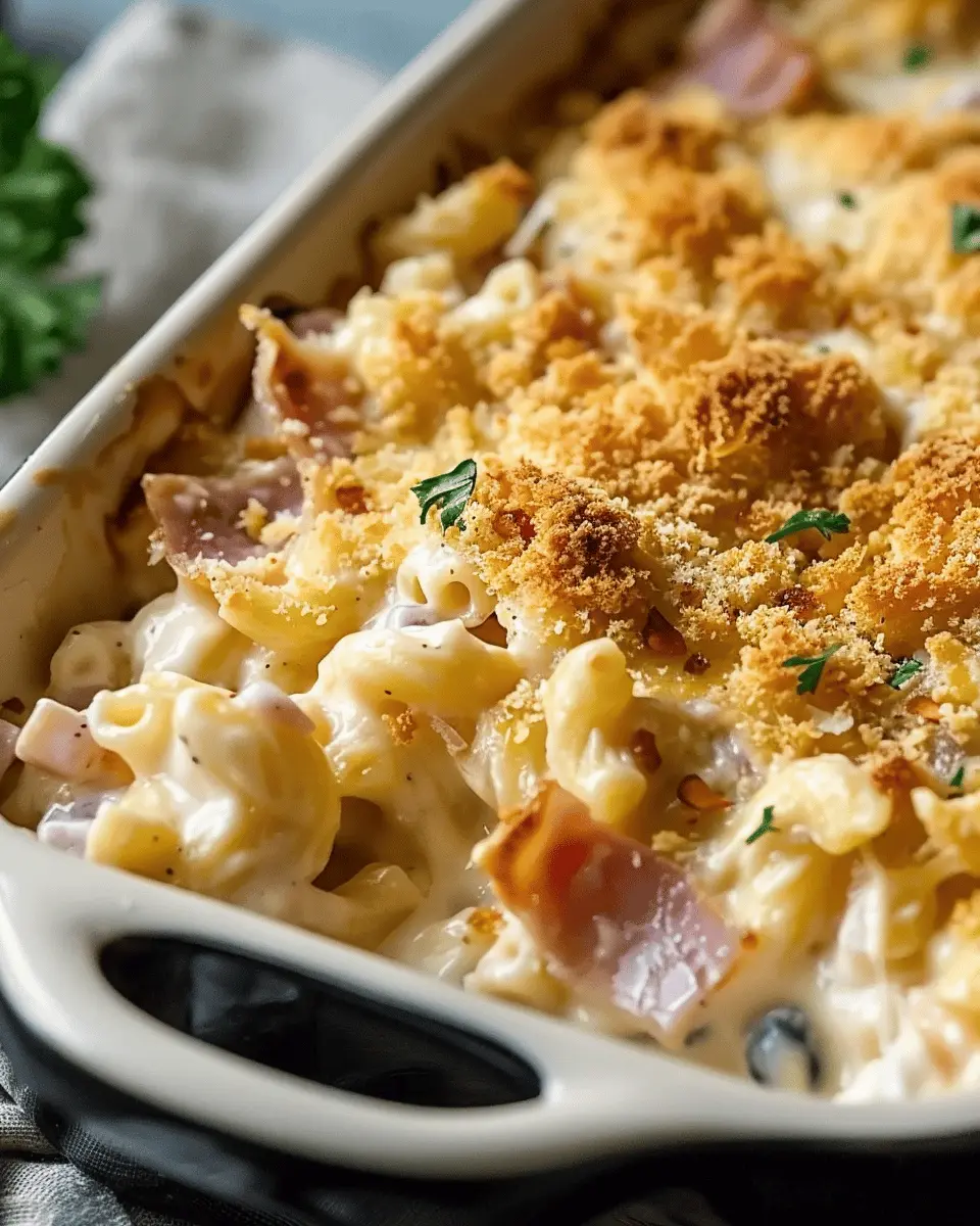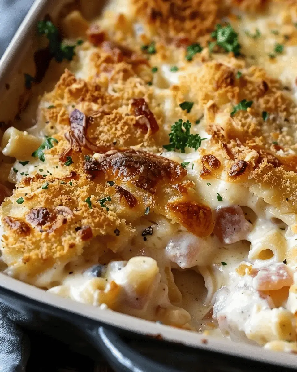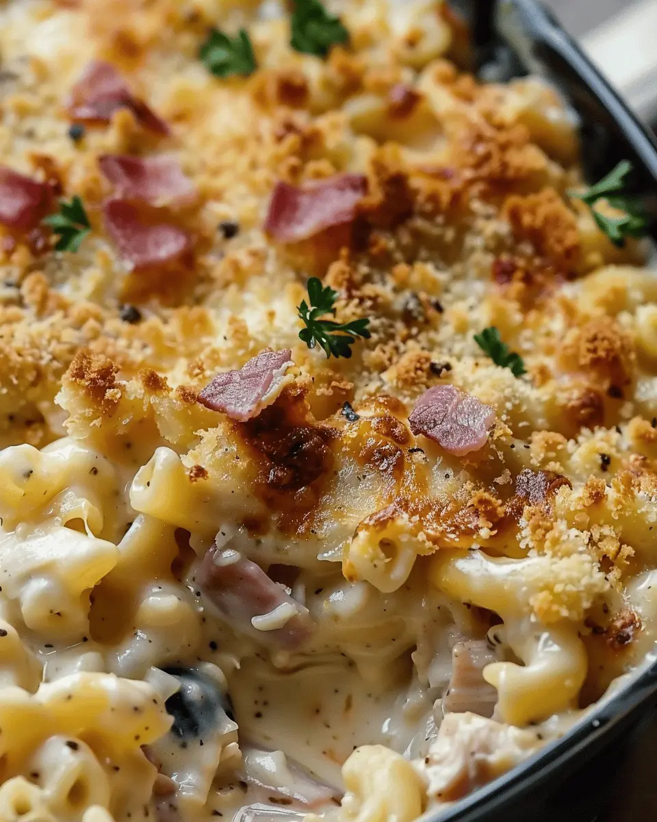 Once your pasta and sauce are ready, it’s time to assemble your casserole. In a large mixing bowl, combine the cooked pasta, shredded rotisserie chicken, diced chicken ham, crumbled turkey bacon, and 1 ½ cups of Swiss cheese. Pour the creamy sauce over the mixture and stir until everything is well-coated. Transfer this delightful blend into a greased 9×13 inch baking dish.