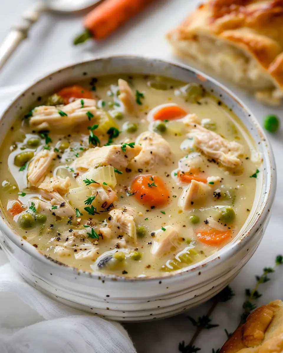 Nutrient-Packed Delight: Filled with tender chicken, hearty vegetables like carrots and peas, and a creamy base, this soup offers a wealth of nutrients in every bowl. According to nutritional studies, incorporating a variety of veggies into meals can improve overall health—perfect for those busy young professionals seeking quick but wholesome meals.