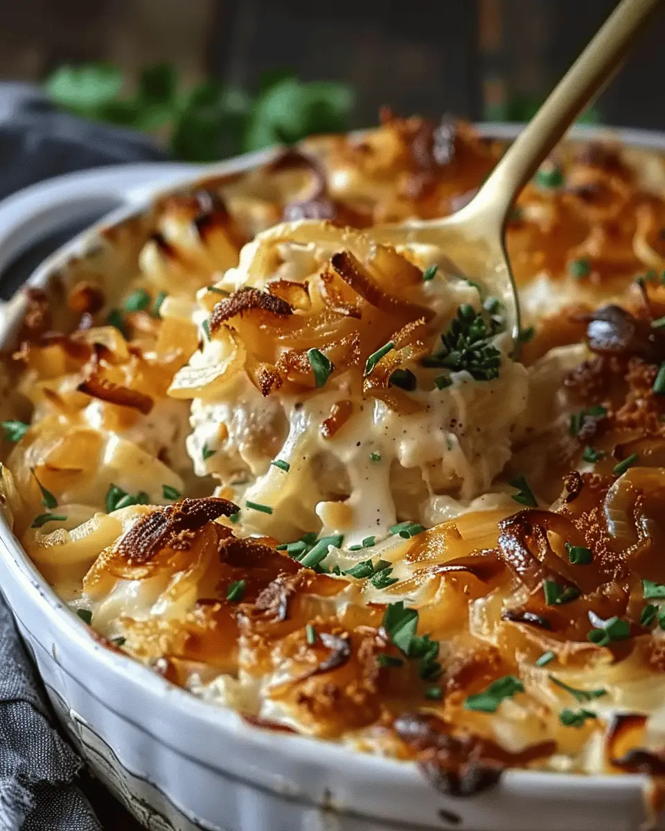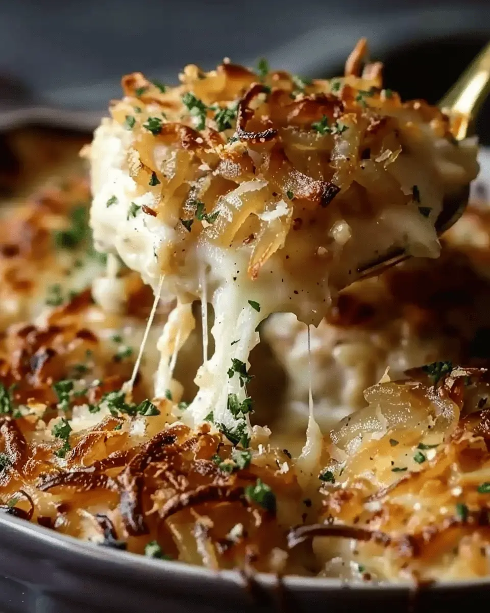 No problem! Dietary adaptations for Comforting French Onion Chicken are simple. For a gluten-free version, use gluten-free flour for thickening the sauce. If you’re avoiding dairy, consider using a plant-based cheese or nutritional yeast for that rich, cheesy flavor. Lastly, for a lighter option, you can swap in skinless chicken breasts instead of thighs, or use turkey bacon to cut down on fat without sacrificing taste.