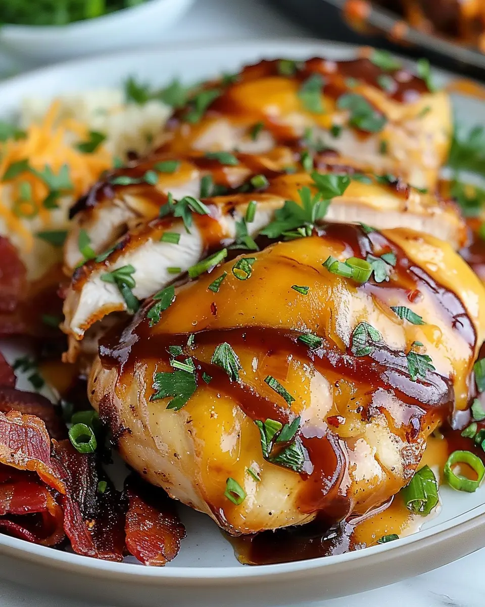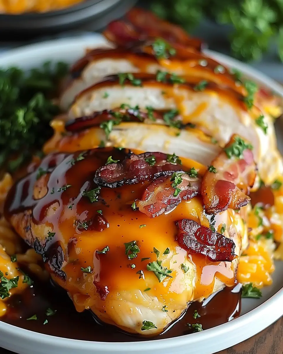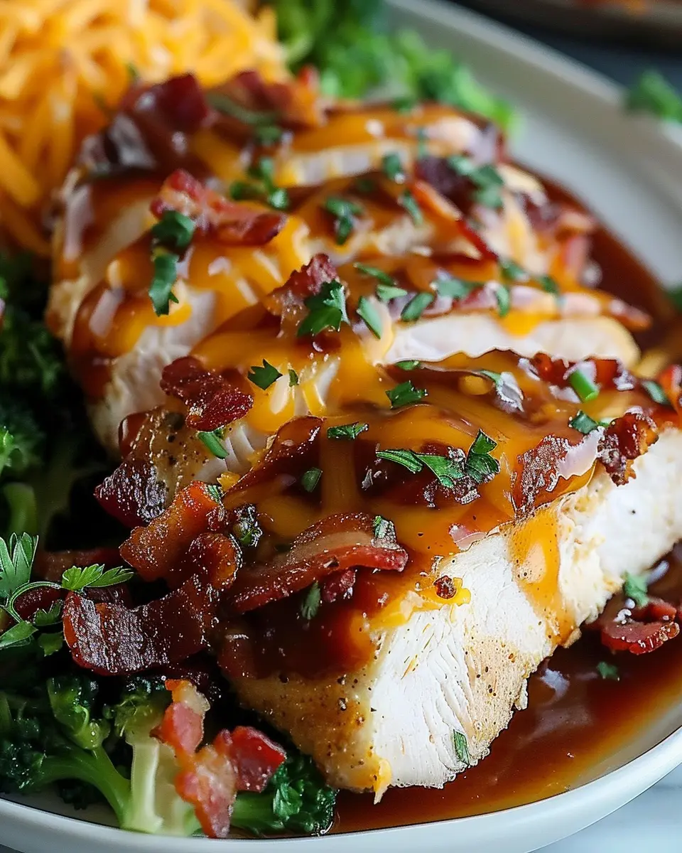 A delightful and juicy chicken dish combining the rich flavors of BBQ, bacon, and cheddar.