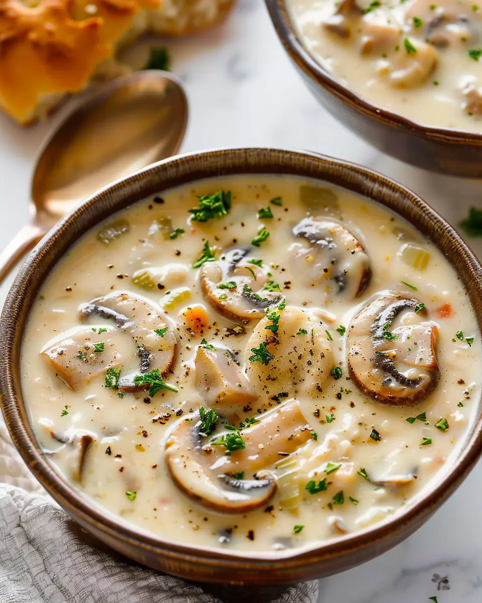 Indulge in a creamy and savory bowl of homemade cream of mushroom soup with a delightful twist of turkey bacon. Perfect for chilly evenings!