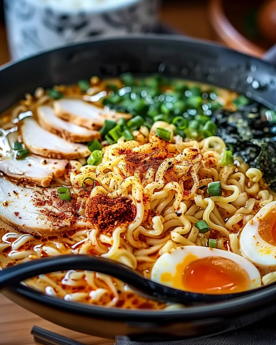 If you’re one of those spice enthusiasts who believes every meal could use a kick, you’re in for a treat. Adding red pepper flakes or a drizzle of sriracha to your creamy garlic chicken ramen not only elevates the flavor profile but also warms you up! Start by sautéing minced garlic alongside fresh chopped chili peppers for a bold base. If you’re feeling adventurous, consider topping your ramen with sliced jalapeños or a spoonful of chili oil for that extra heat. This version is perfect for cozy nights in or impressing friends at dinner parties.