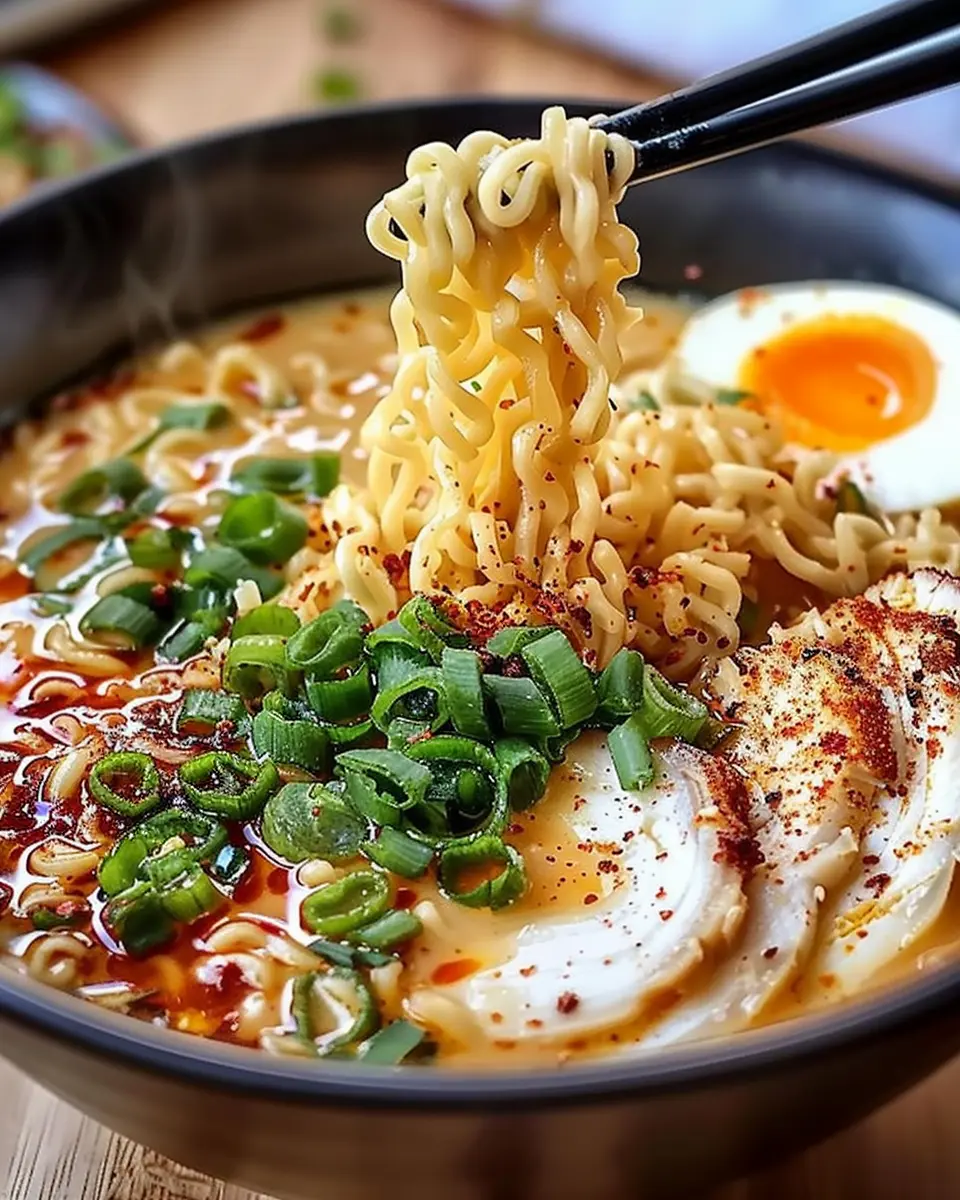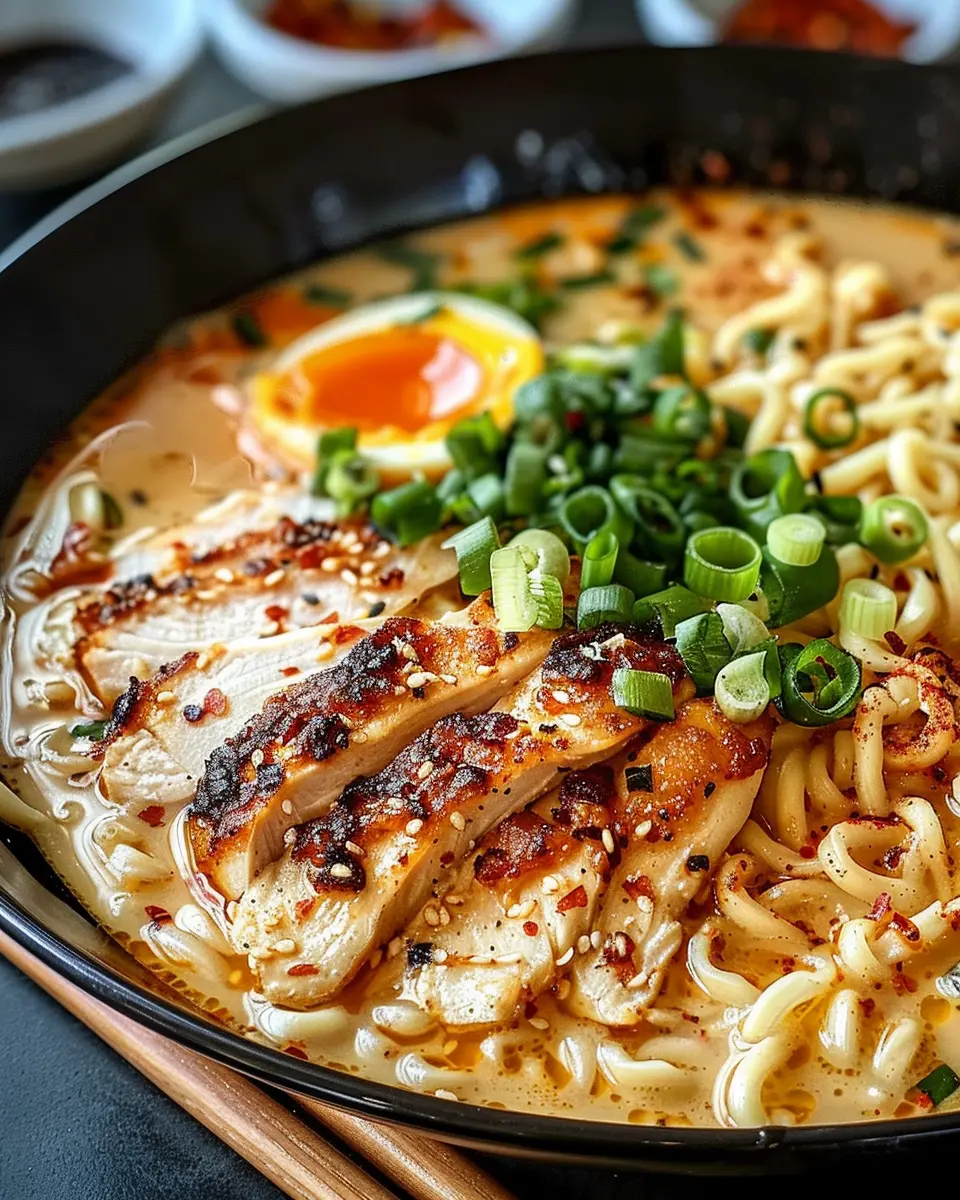 Indulge in the creamy goodness of this Garlic Chicken Ramen, a comforting dish perfect for any occasion.
