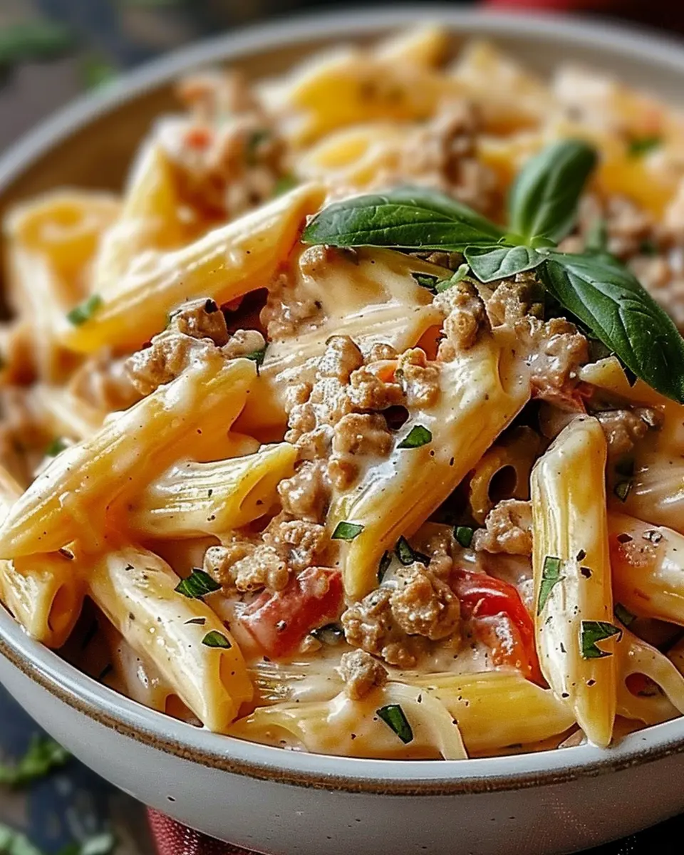 • Combine the cooked pasta with the creamy sauce and beef in your skillet. Gently fold everything together until the pasta is beautifully coated with the sauce.