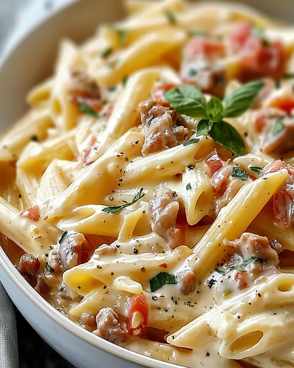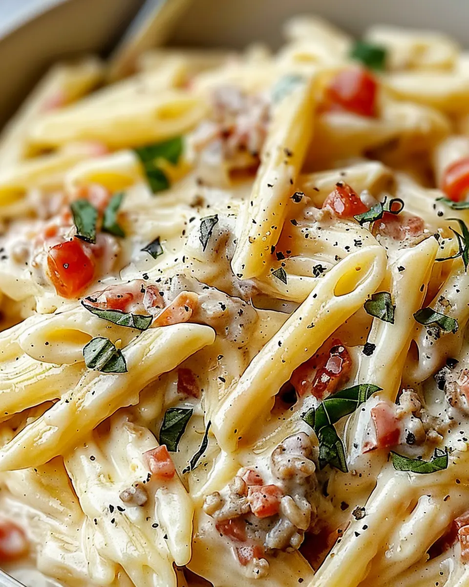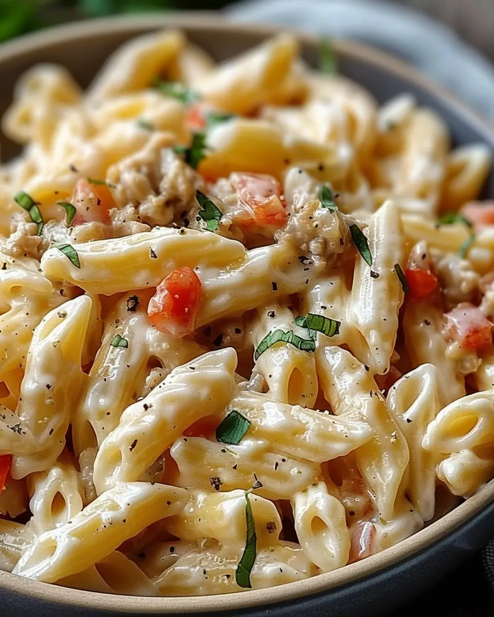 A delicious creamy pasta dish featuring Rotel and turkey bacon, perfect for a comforting dinner.