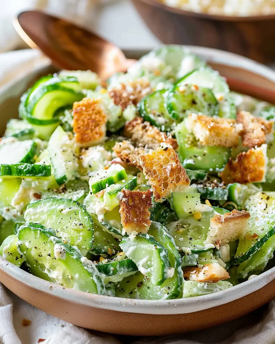 • Toss in a handful of croutons into the cucumber and dressing mixture right before serving to ensure they stay crunchy!