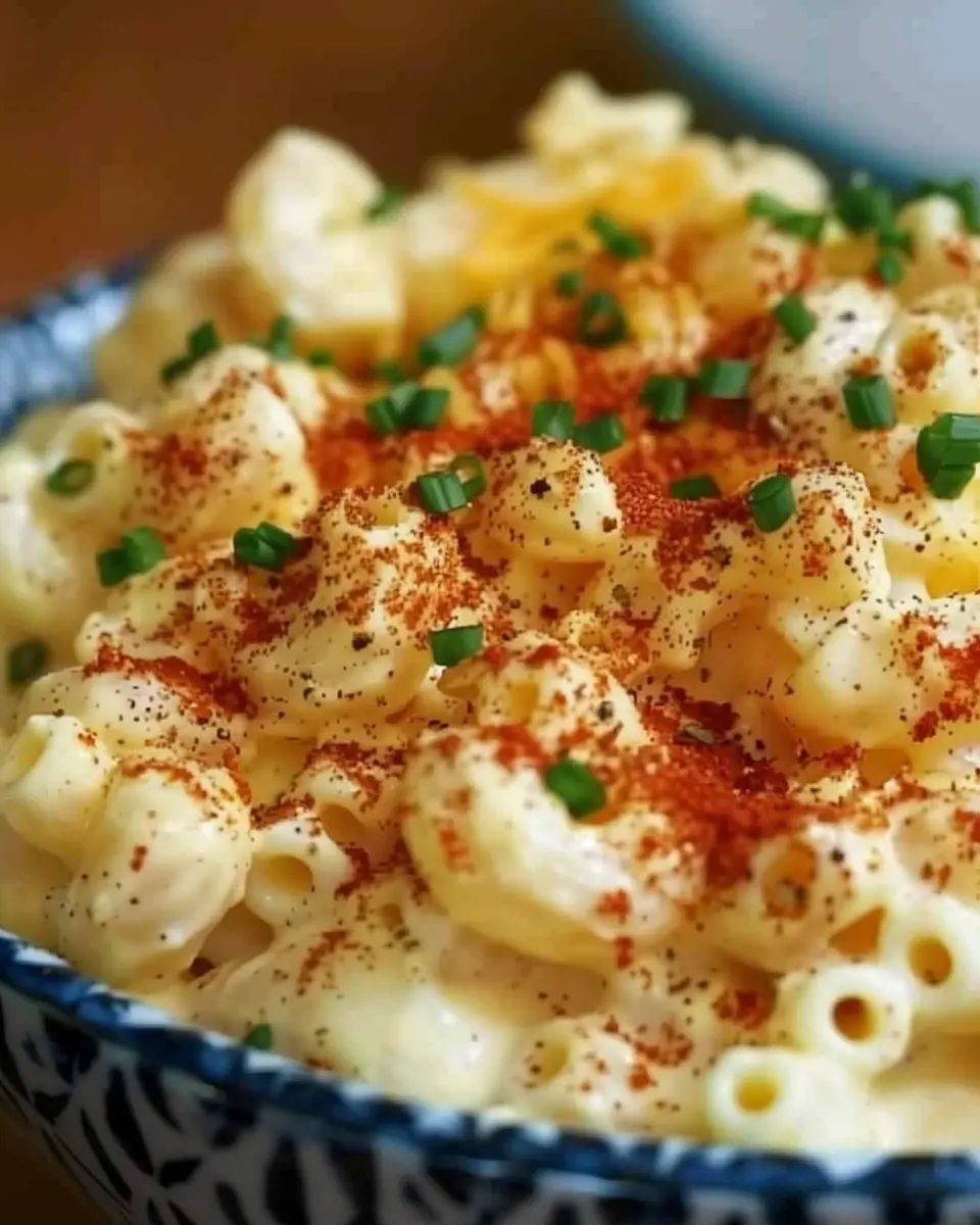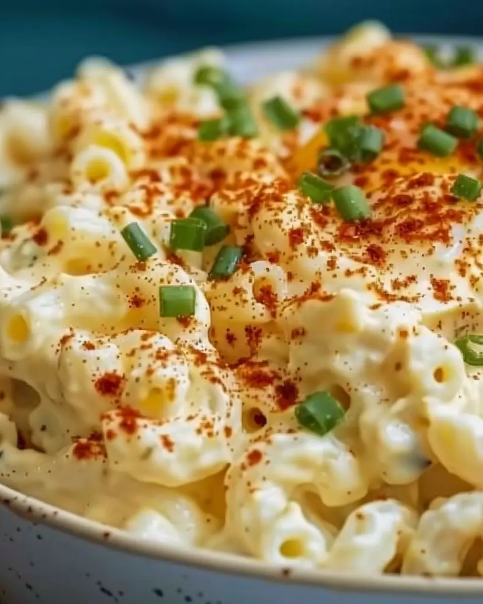 A creamy and flavorful macaron salad that combines the classic tastes of deviled eggs with the crunch of turkey bacon.