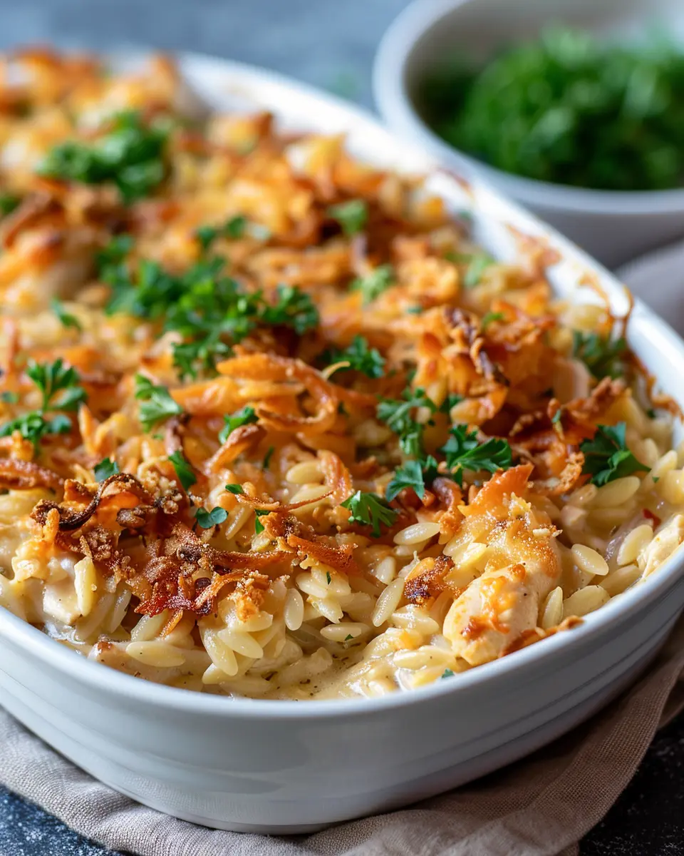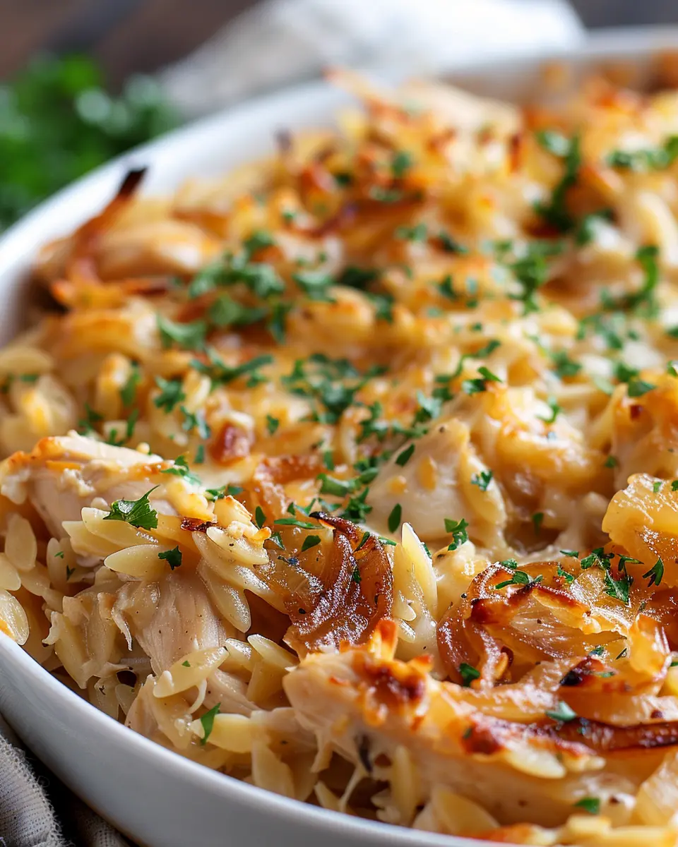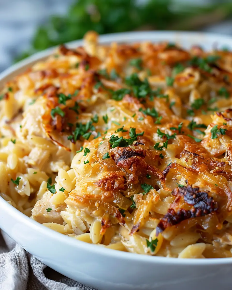 Delight in this French Onion Chicken Orzo Casserole, a cozy dish that brings comfort and flavor to your table.