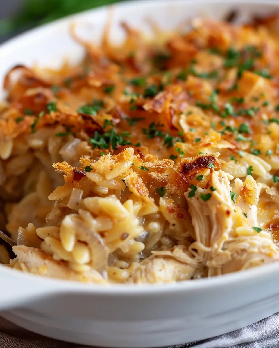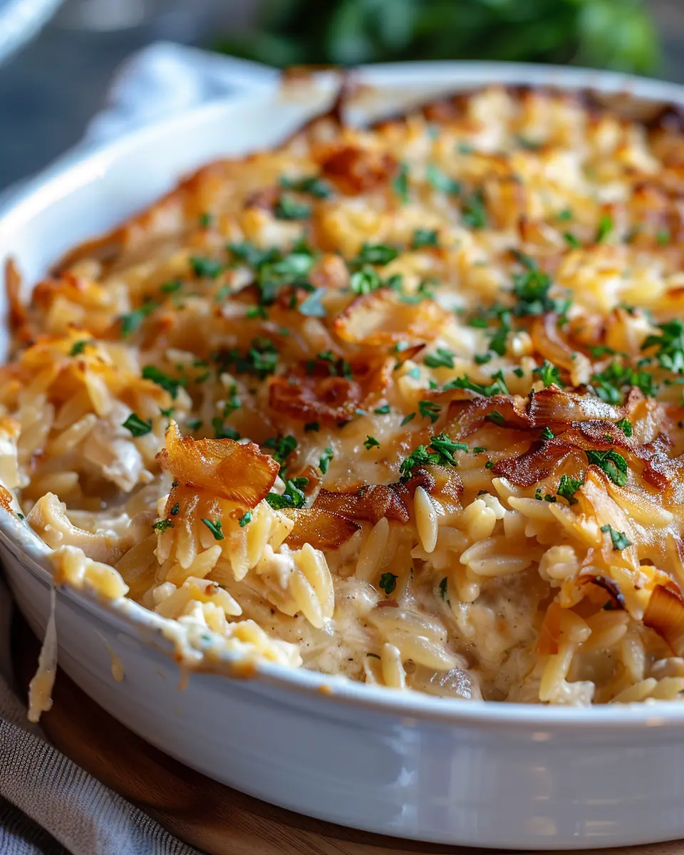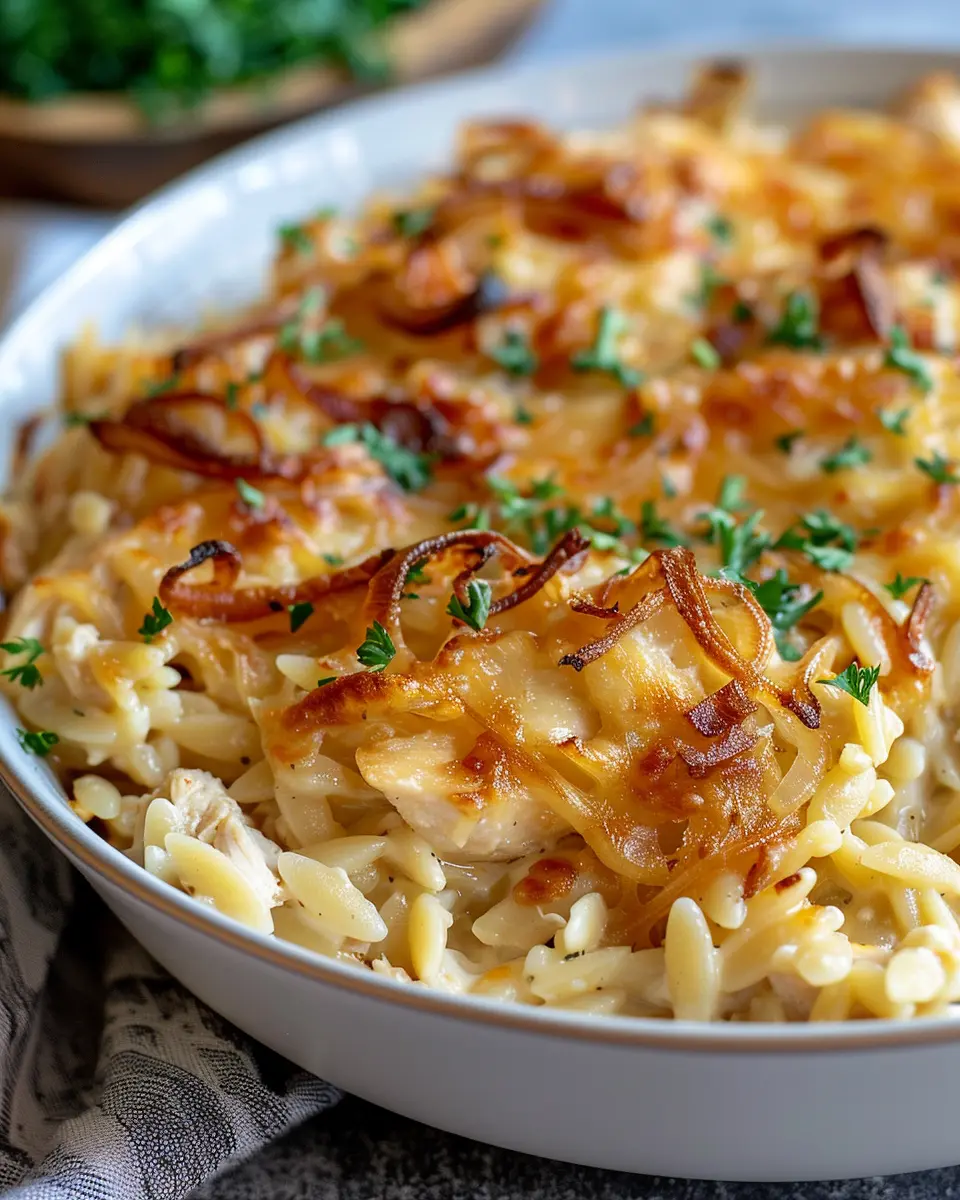 A comforting casserole combining French onion flavors with chicken and orzo.