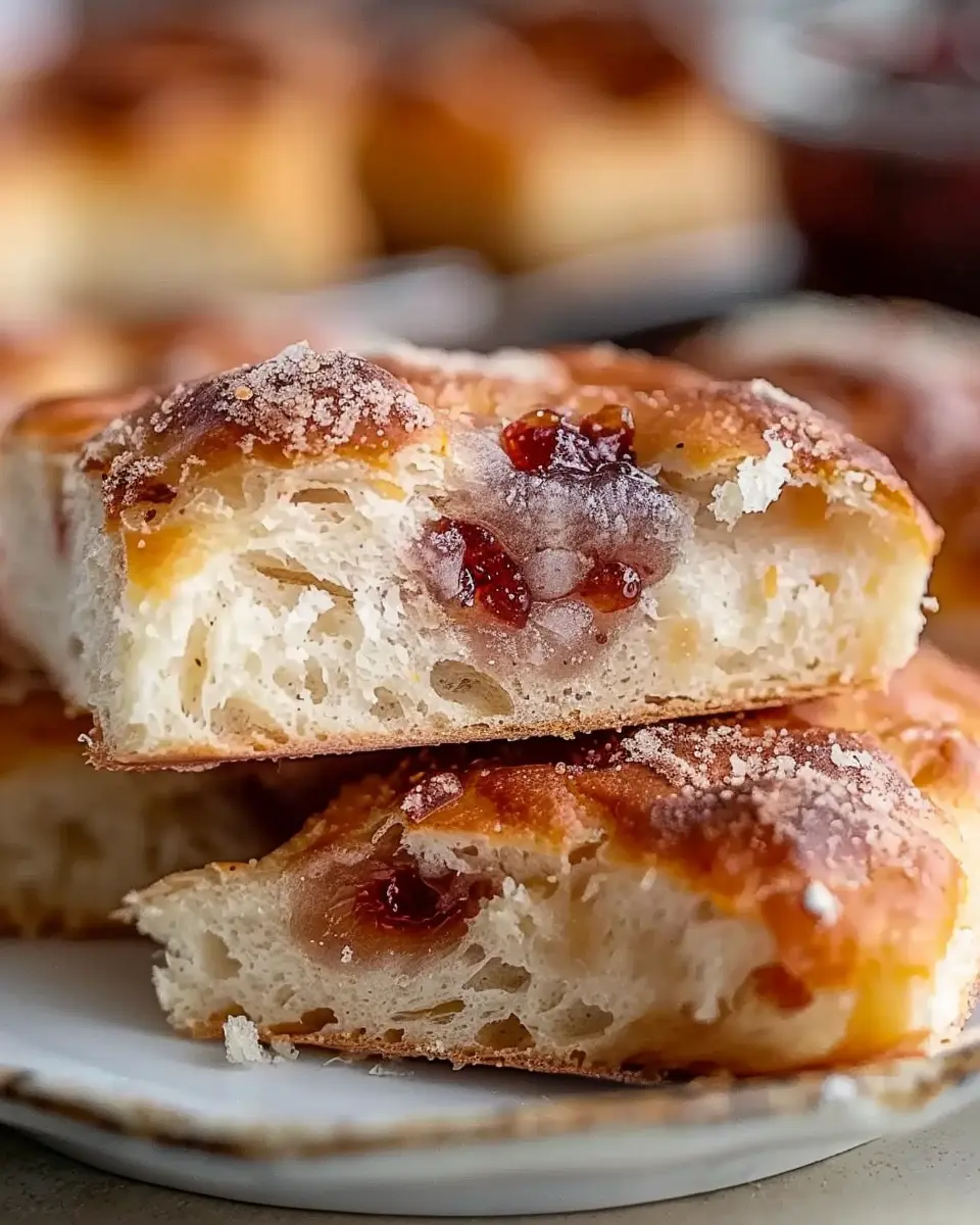 This homemade jam donut focaccia is a delightful blend of soft, pillowy bread topped with sweet jam and a dusting of sugar, perfect for a sweet treat.