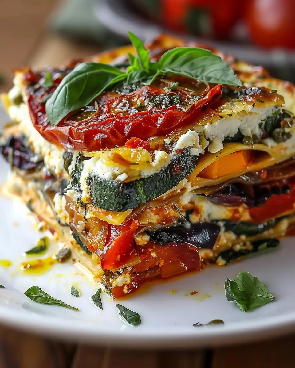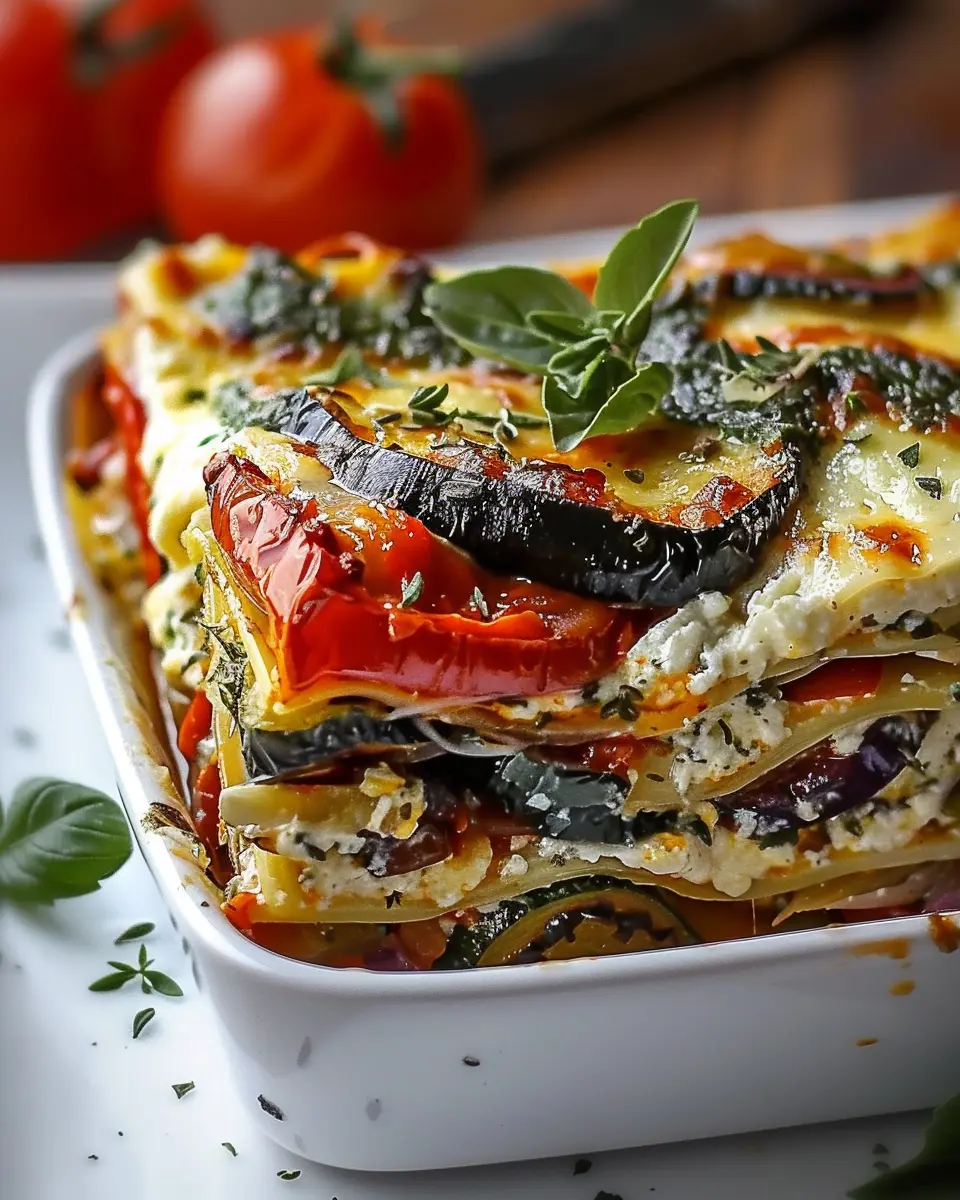 A delicious and colorful vegetable lasagna packed with Mediterranean flavors, perfect for a hearty meal.