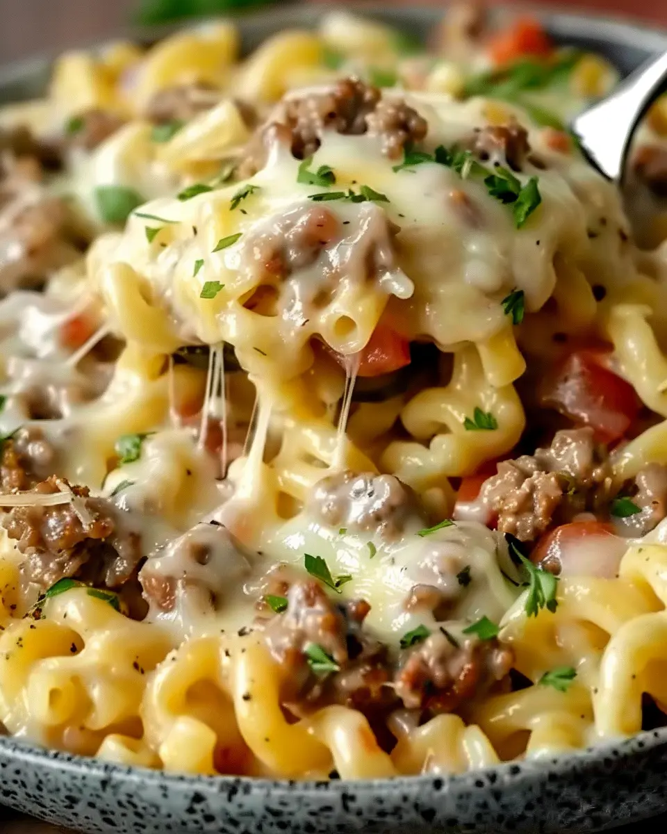 Indulge in a creamy, cheesy pasta dish that combines the flavors of a loaded cheeseburger with the comfort of alfredo pasta.
