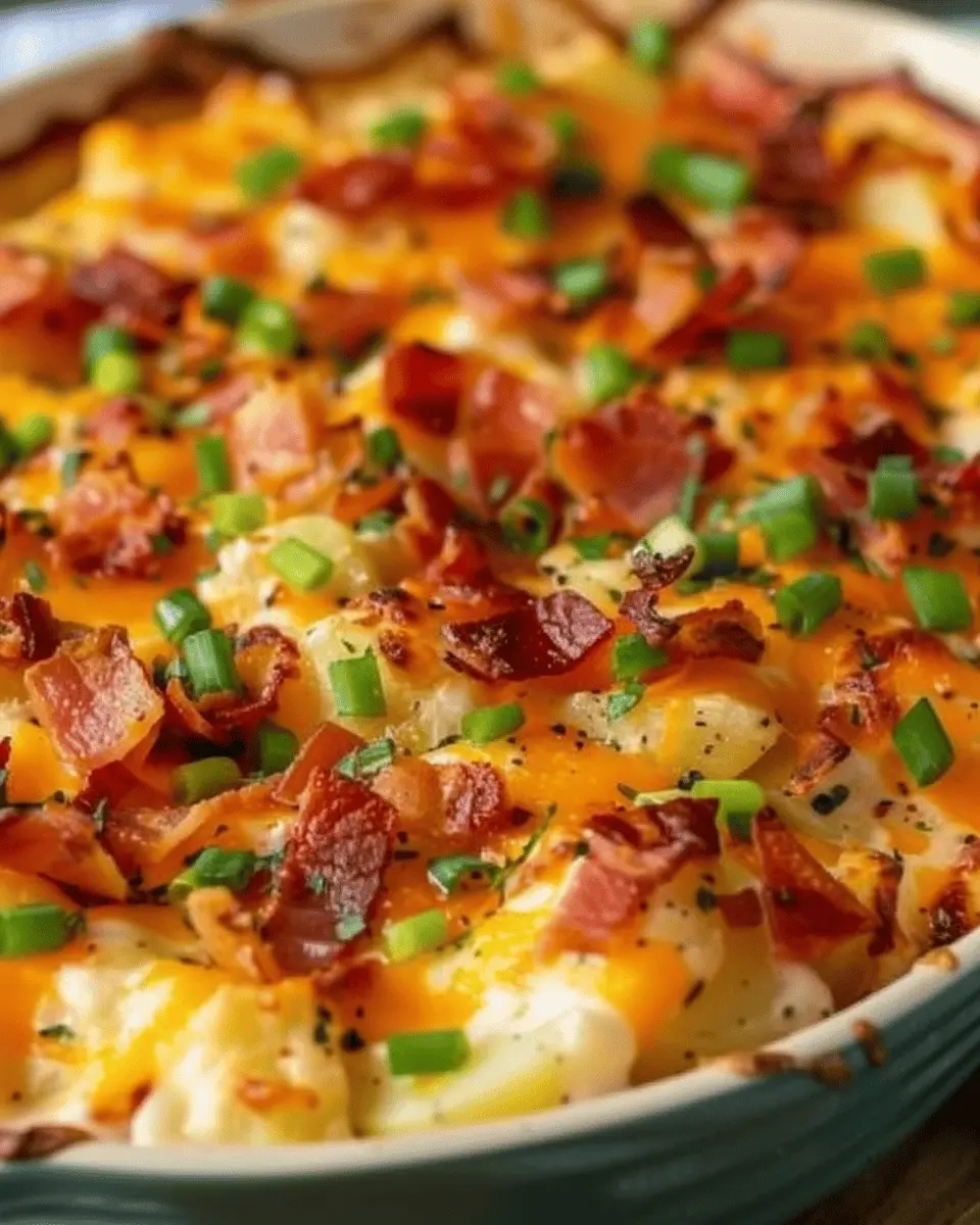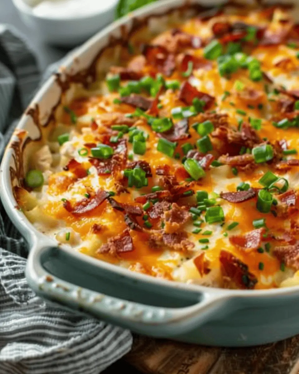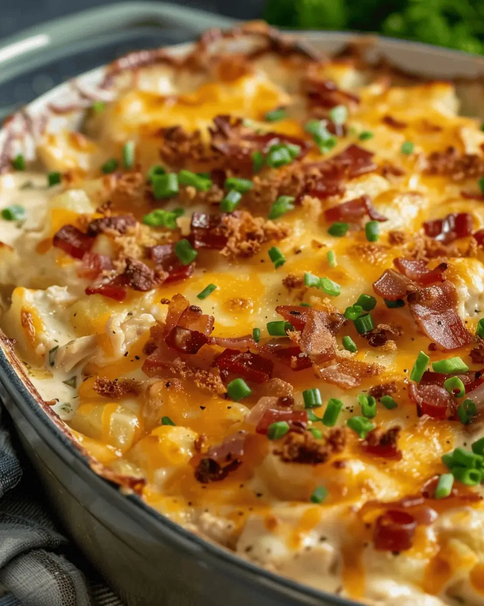 A delicious and comforting casserole that combines the joy of loaded potatoes with tender chicken, turkey bacon, and a flavorful ranch dressing.