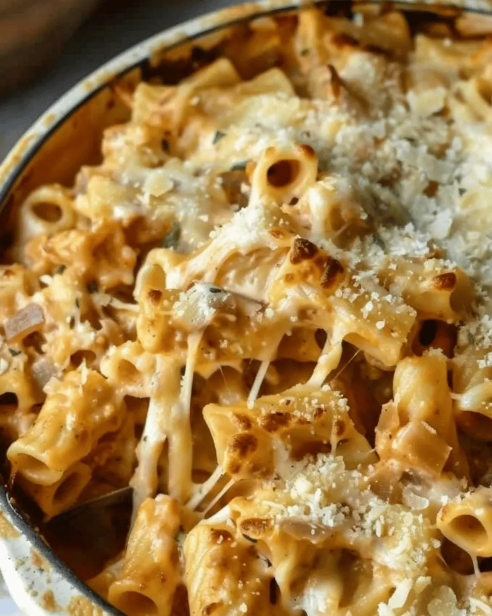 Home » Recipes » One Pot French Onion Pasta with Turkey Bacon: Easy & Delicious