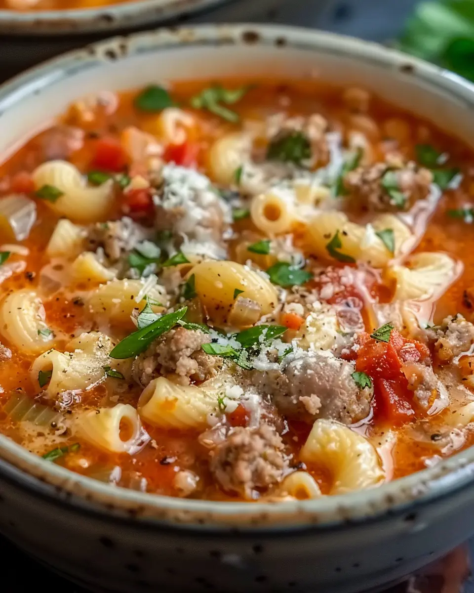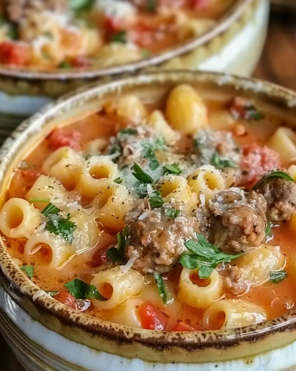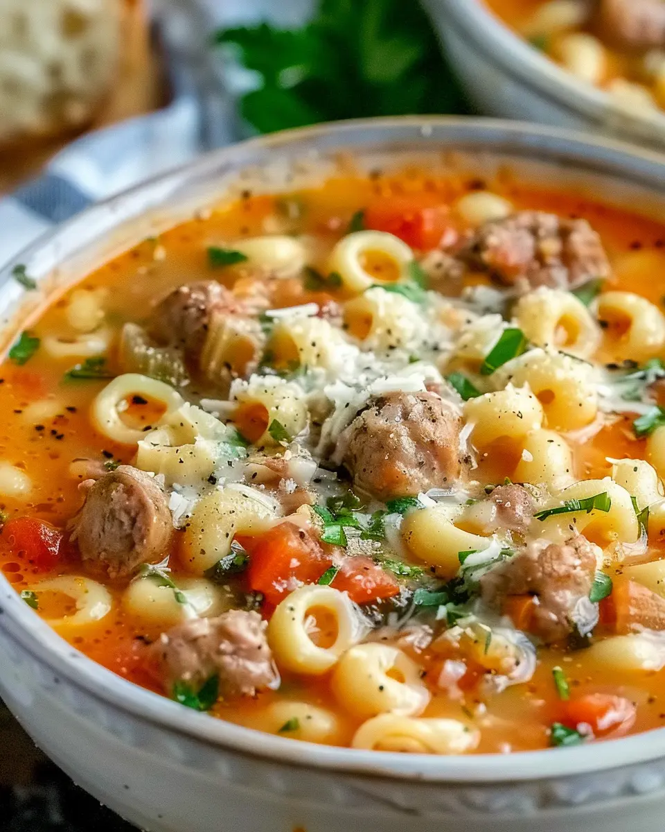 Enjoy a warm bowl of Parmesan Italian Sausage Ditalini Soup, a delightful combination of flavors that brings comfort on a cold day.