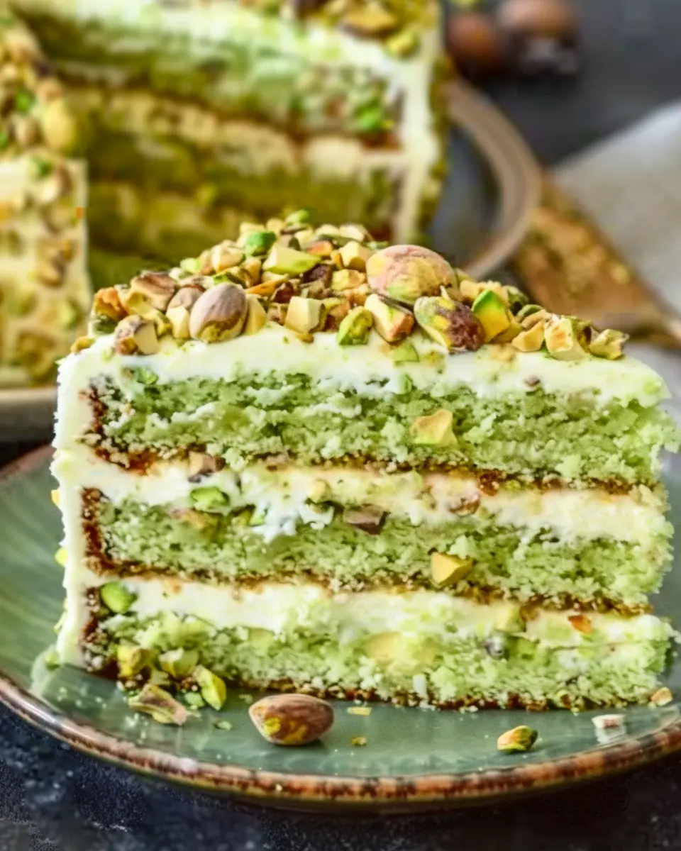 A luscious and decadent dessert that combines layers of fluffy cake with creamy mascarpone frosting and delightful pistachio flavor.