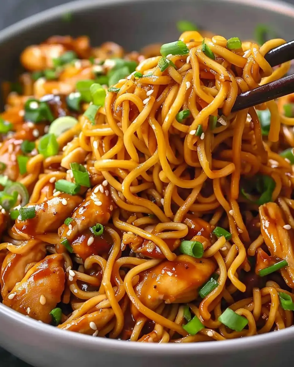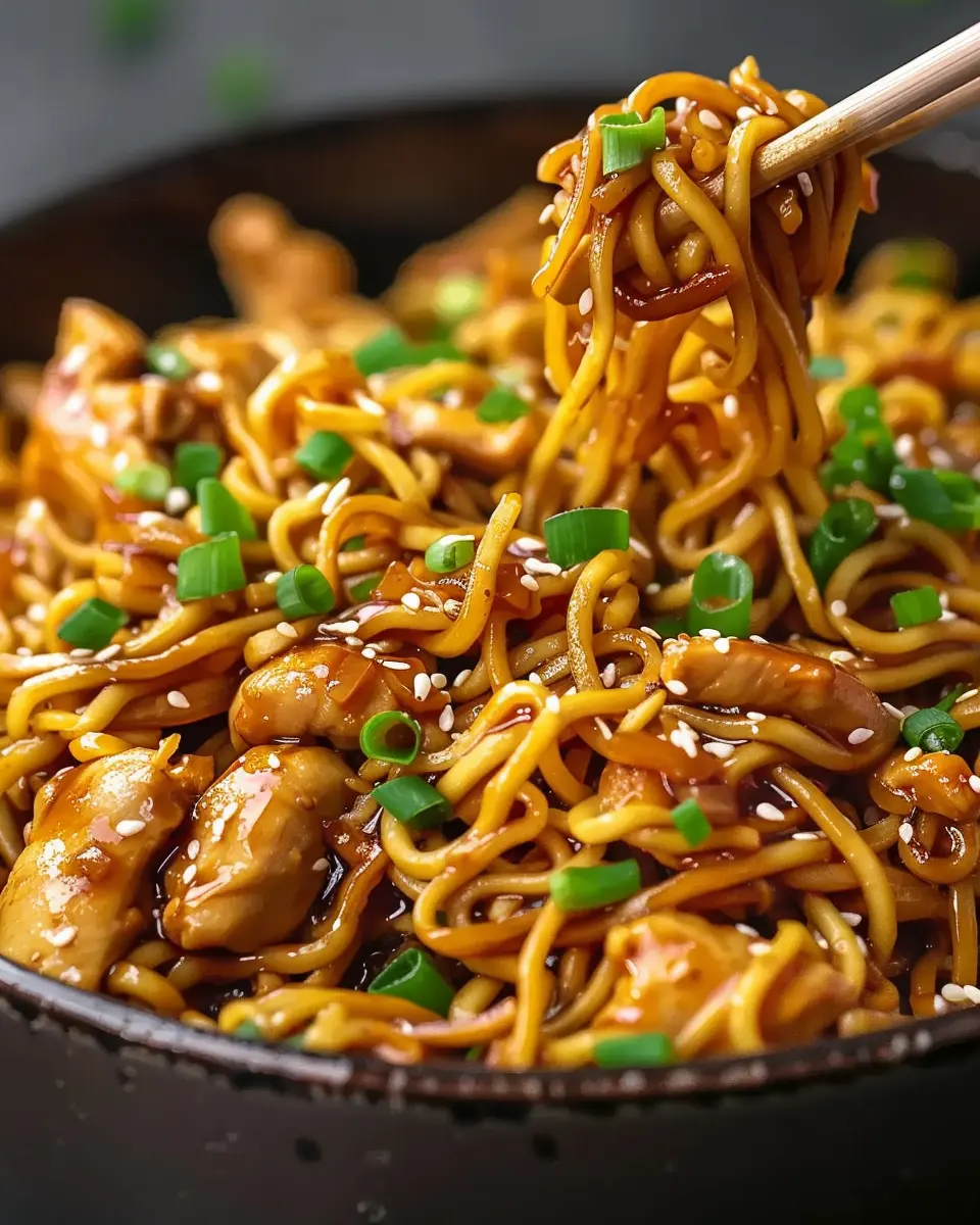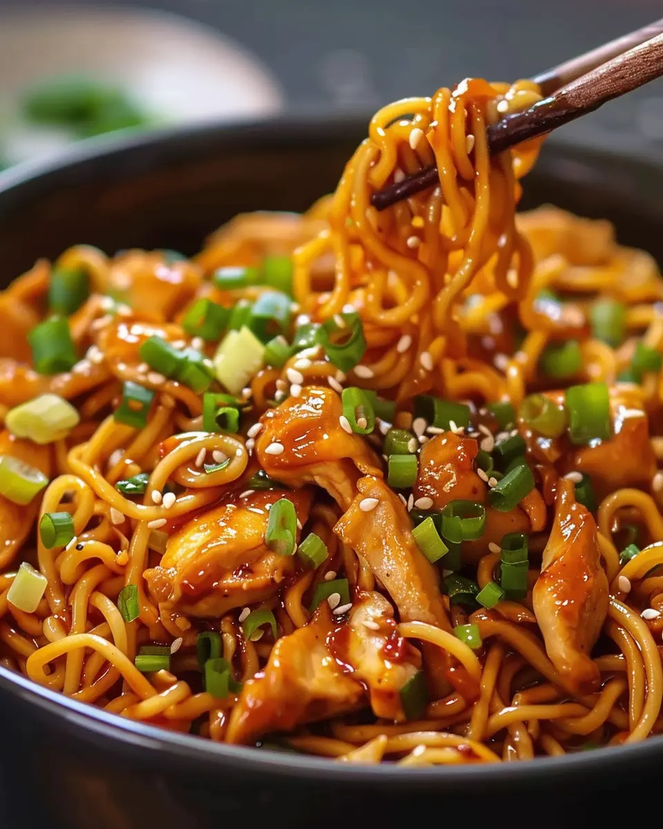 A delicious blend of sticky garlic chicken with flavorful noodles, perfect for a quick and indulgent meal.